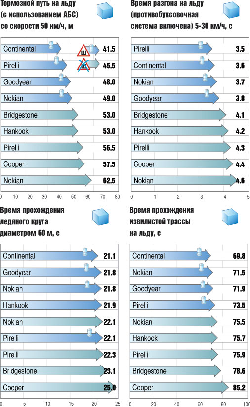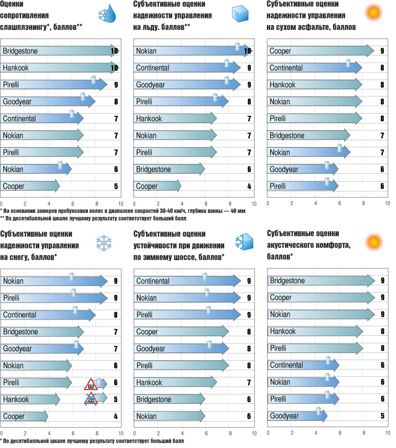 Откатав стандартную программу испытаний, эксперты перевели все результаты в баллы (по десятибалльной шкале: чем лучше результат, тем выше балл) и сложили их с учетом весомости тех или иных потребительских качеств. Приоритеты здесь такие: сцепные свойства и управляемость на льду (45%), на снегу (25%), на асфальте (15%), сопротивление слашплэнингу (10%), акустический комфорт (5%).